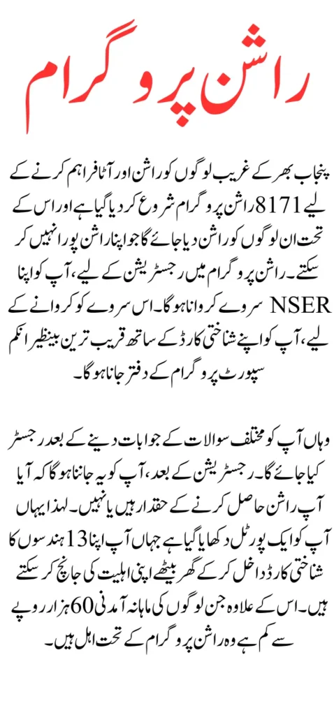 8171 Rashan program has been started to provide Rashan and flour to poor people across Punjab. And under this ration will be given to those who cannot meet their ration. For registration in ration program, you have to get your NSER survey done. To get this survey done, you have to go to the nearest Benazir Income Support Program office with your identity card.